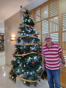 geschmückte Weihnachtsbaum in der Lobby zeigt, dass es sich um die