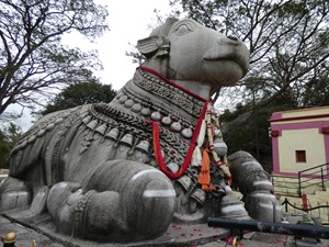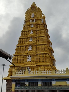 | Am nächsten Morgen stand als erstes der Besuch des Chamundeshwari-Tempel auf dem Chamundi-Hügel bei Mysuru auf unserem Programm. Der Tempel liegt auf etwa 1.060 Meter über dem Meeresspiegel. Pilger können den Fußweg vom Fuße des Hügels nutzen, der Tempel ist dann über 1.008 Stufen zu erreichen. Aber wir haben den komfortablen Weg, mit dem Bus, gewählt. | ||||||||||||||||||