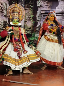 | Heute Abend haben wir uns eine Vorführung des Kathakali-Maskentanzes angeschaut. Seine farbenprächtigen Masken, ausdrucksstarke Gestik und mythologische Themen sind weltweit bekannt. Tanz, Schauspiel, Musik und Ritual vereinigen sich zu einem besonderen Erlebnis. Vorher durften wir den Künstlern beim aufwendigen Schminken zuschauen. Die Tänzer trainieren jahrelang um die Kontrolle über die Gesichtsmuskeln und Augenbewegungen zu erlangen. | ||||||||||||||||||